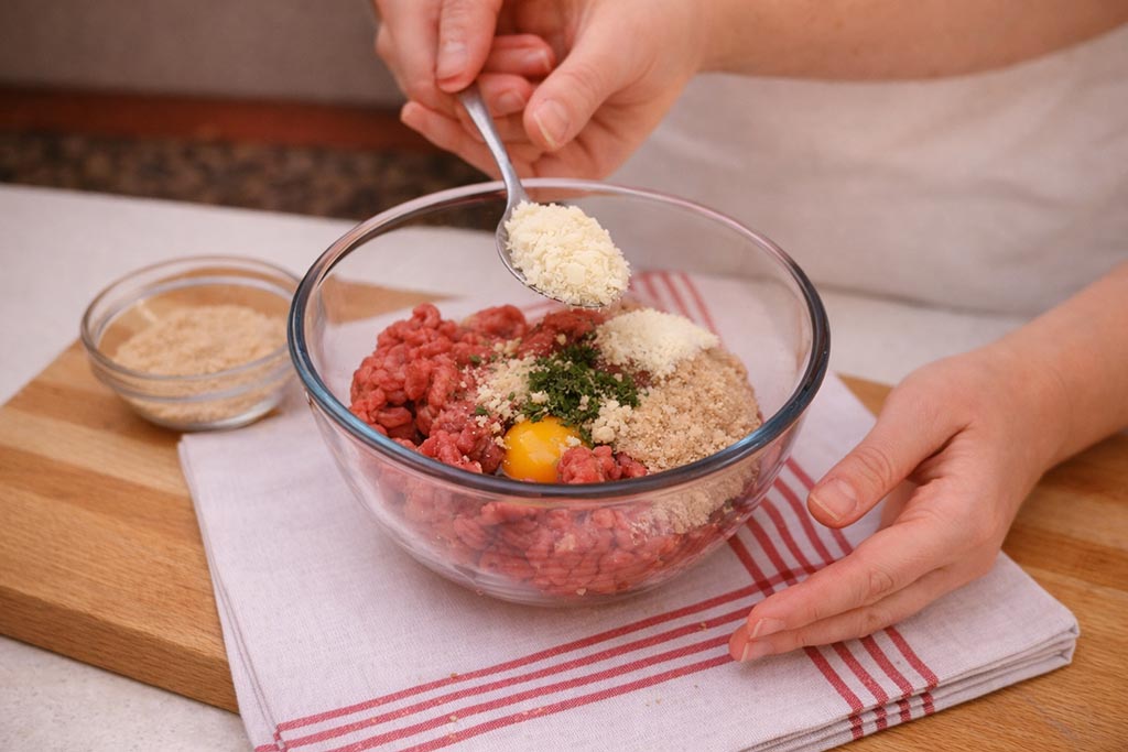 - U meso dodajte jaja, prezle, rendani parmezan, seckani peršun i beli luk, pa sve temeljno izmešajte rukom ili kašikom dok ne dobijete kompaktnu i ujednačenu smesu.