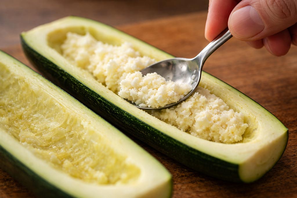 Tikvice operite i uklonite krajeve. Kuvajte ih na pari oko 10 minuta, dok blago ne omekšaju, ali da i dalje zadrže oblik. Izvadite ih i ostavite da se prohlade toliko da možete da radite sa njima.- Uz pomoć kašike pažljivo izdubite sredinu svake tikvice po dužini, vodeći računa da zidovi ostanu čvrsti i da tikvice ne puknu. Dobijeni prostor treba da bude dovoljno dubok za punjenje.