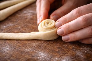 Formiranje centraOd odsečenog prstena testa napravite 4 dela, oblikujte male “ruže” i rasporedite ih u sredinu pogače.