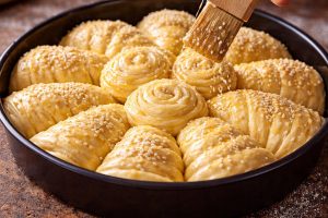 PremazivanjePre pečenja pogaču premažite umućenim žumancetom i pospite susamom.