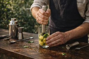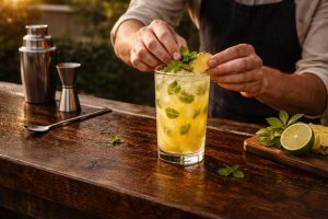 Priprema baze ukusaU šejker ili čvrstu čašu dodajte isečen ananas i listiće sveže nane. Lagano izgnječite tučkom. Cilj je da ananas pusti sok, a nana aromu, ali bez agresivnog gnječenja kako ne bi pustila gorčinu.