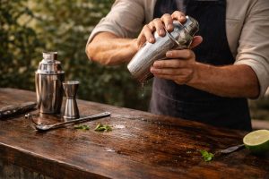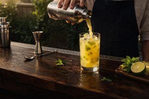 Balansiranje tečnostiDodajte kokosovu vodu, sveže ceđeni sok od limete i šećerni sirup. Promešajte kratko da se ukusi povežu i formiraju bazu napitka.